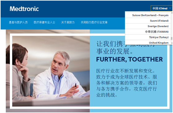 经网友举报,环环查证,在美敦力的中文官网上,选择国家的选项卡,也明显把“中华民国(Taiwan)”与其他国家并列。美国美敦力公司(Medtronic, Inc.)成立于1949年,总部位于美国明尼苏达州明尼阿波利斯市,是全球领先的医疗科技公司,致力于为慢性疾病患者提供终身的治疗方案。