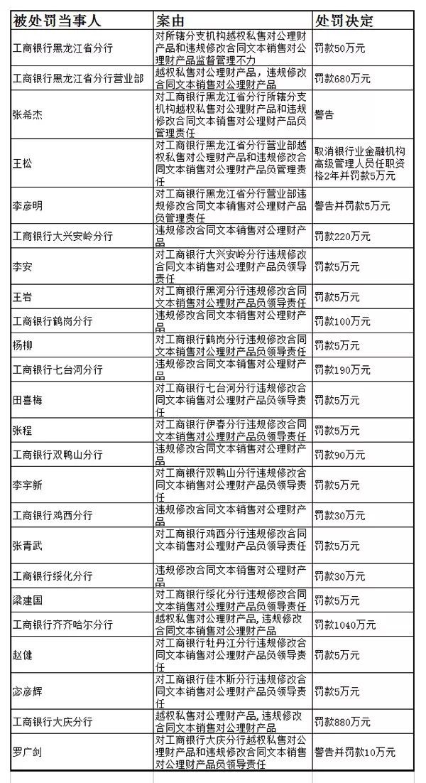 黑龙江银监局按照过罚相当原则,依法对工行黑龙江省分行及所辖13家二级分行及责任人予以累计3400万元罚款,其中机构罚款3310万元,高管人员罚款90万元,给予15名高管人员取消任职资格、警告等处罚,并责令工行黑龙江省分行按照党规党纪、政纪和内部规章,对有关责任人给予纪律处分。此外,黑龙江银监局对内部监管履职不力人员进行了执纪问责。