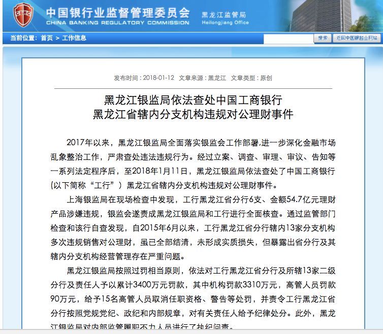 黑龙江银监局发布消息称,经过立案、调查、审理、审议、告知等一系列法定程序后,至2018年1月11日,依法查处了中国工商银行黑龙江省辖内分支机构6支、共计54.7亿元的违规对公理财事件,涉案银行包括工行黑龙江省分行及所辖13家二级分行。