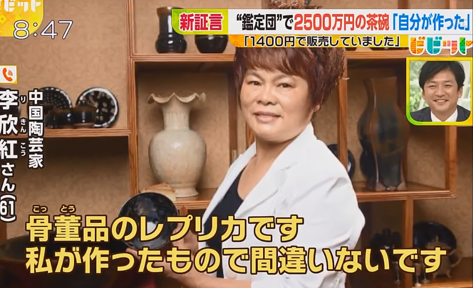 节目中,中国福建的陶艺家李欣红(61岁)表示:“这是我做的古董复制品,可以确定是我制作的。并且已经以1400日元的价格卖掉了。”