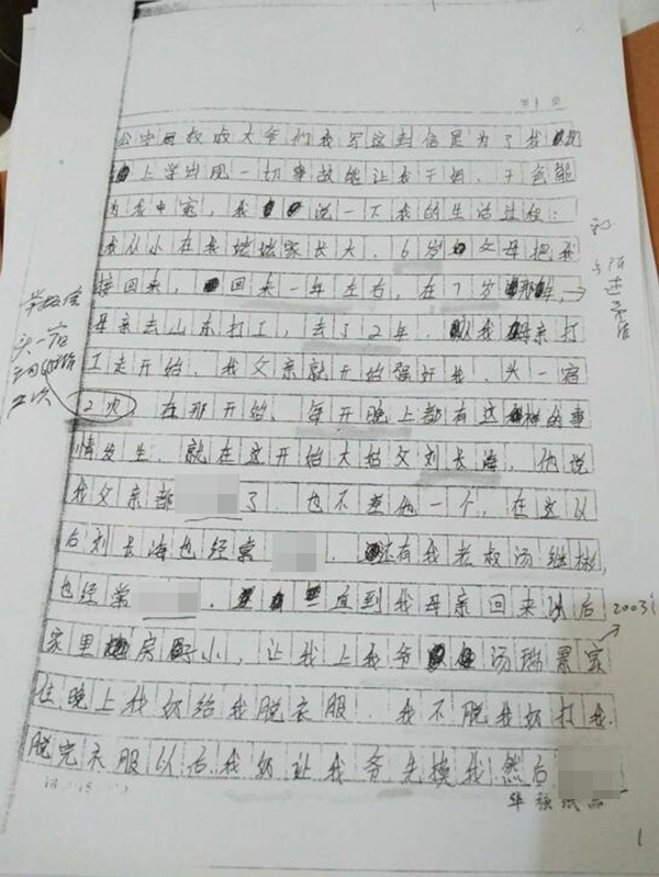2008年10月3日,她向黑龙江省五大连池市龙镇警方写了一封举报信,称其从7岁开始被父亲、爷爷、叔叔、姑父、老师、村主任、乡邻等十余人强奸、轮奸,前后已有7年。