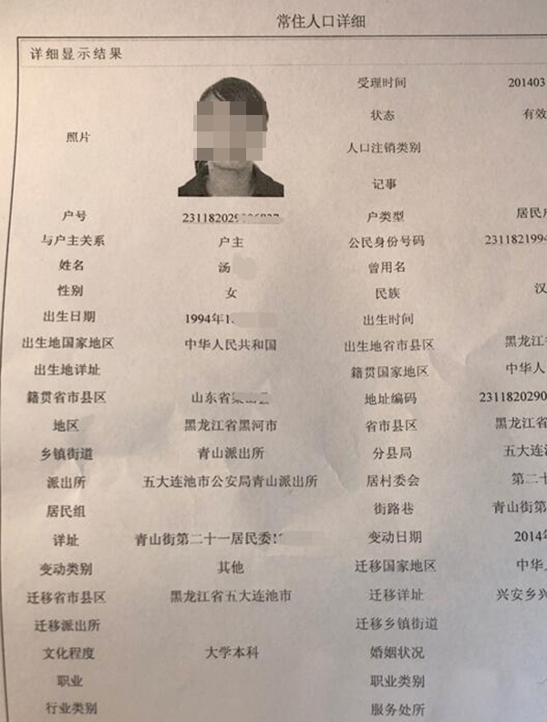 现在汤玉的户口已从农业户变为城镇户,“这是户政科特批的”,王警官说,“为什么要改名字?为什么要从小兴安迁这来?她的一切都是她找户政科安排的。”