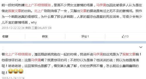 马伊琍拍戏一部接着一部。之前很火的一部讲述都市隐婚爱情故事的《北上广不相信眼泪》,虽然剧情不咋的,但是从头到尾因为激情戏很多,当时网友在看的时候都纷纷表示:“马伊琍这激情戏如此之多,真不是在报复文章?”
