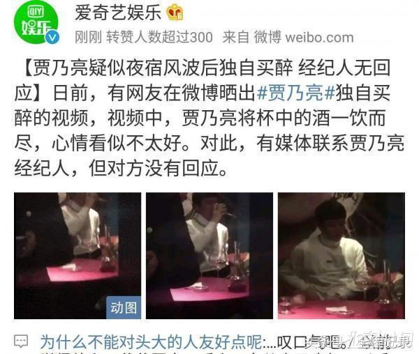 随后,有网友在微博晒出贾乃亮独自买醉的视频,被暗指受“李小璐夜宿PG ONE家”风波影响。虽然不知道,这是在夜宿事件发生的之前还是之后,但视频中,贾乃亮手捧酒杯,直接一杯下肚,心情看似不太好。