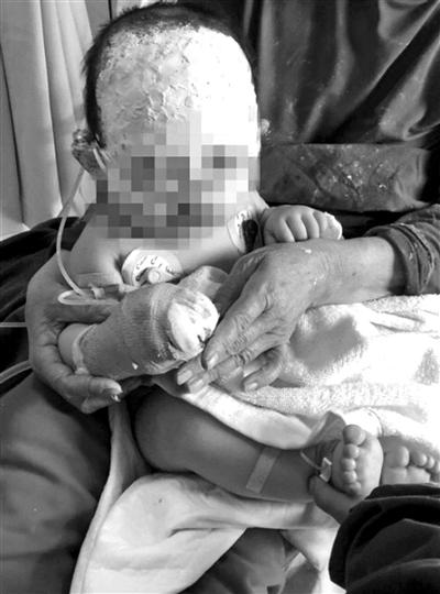 1月26日,还差几天就满6个月的航航像往常一样在家睡午觉。担心孩子着凉,奶奶在航航床上放了一个取暖器"小太阳"。不久,奶奶因故外出,大概10分钟后再回来,航航已经被严重烧伤。不仅整个右手被全部烧焦,脸也被烧得面目全非。