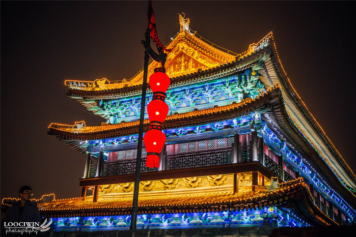 长安城的夜色极美,来回穿梭的车流好像时空交错一般,如果时间真的有平行时空一说,我真以为有那么一群古人在我们看不到的平行时空下,依然过着繁荣生活,路上跑的是马车轿子,两边的楼宇是平房小屋或者村民的菜地。城墙永宁门正对着的就是钟楼,中轴线瞭望长安,别有一番情调。