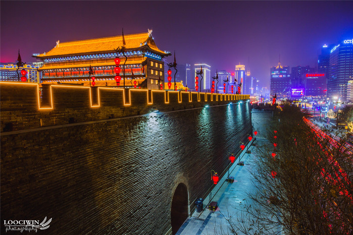 高大魁梧的城墙,层次分明的城楼,站在上方俯瞰西安的夜景,历史的片段犹如在眼前放映,看到城墙边围着的护城河,自然是与西安城墙形成了完好严密的防御