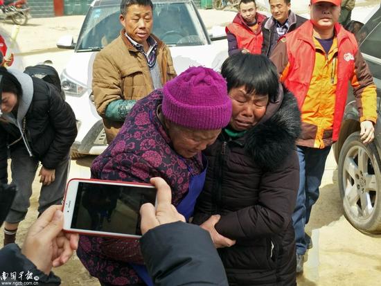▲兰小英(右前)与堂姐兰玉莲相拥而泣,后面(中间)男子为弟弟兰汉群。宝贝回家志愿者提供