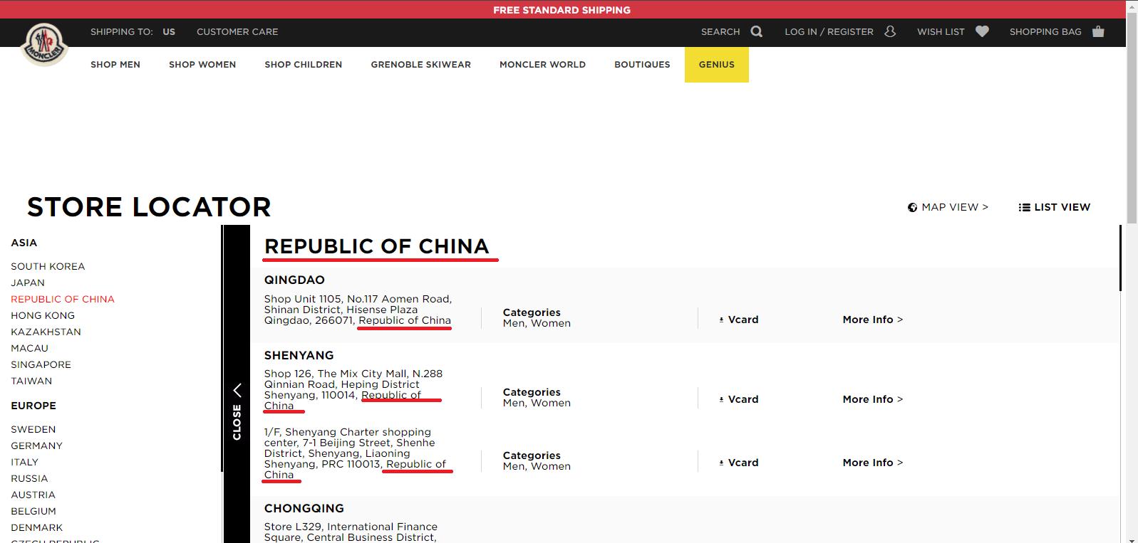 与此同时,Moncler英文官网还出现了一个荒谬的政治错误--将中国的英文全称写为"Republic of China(中华民国)"。