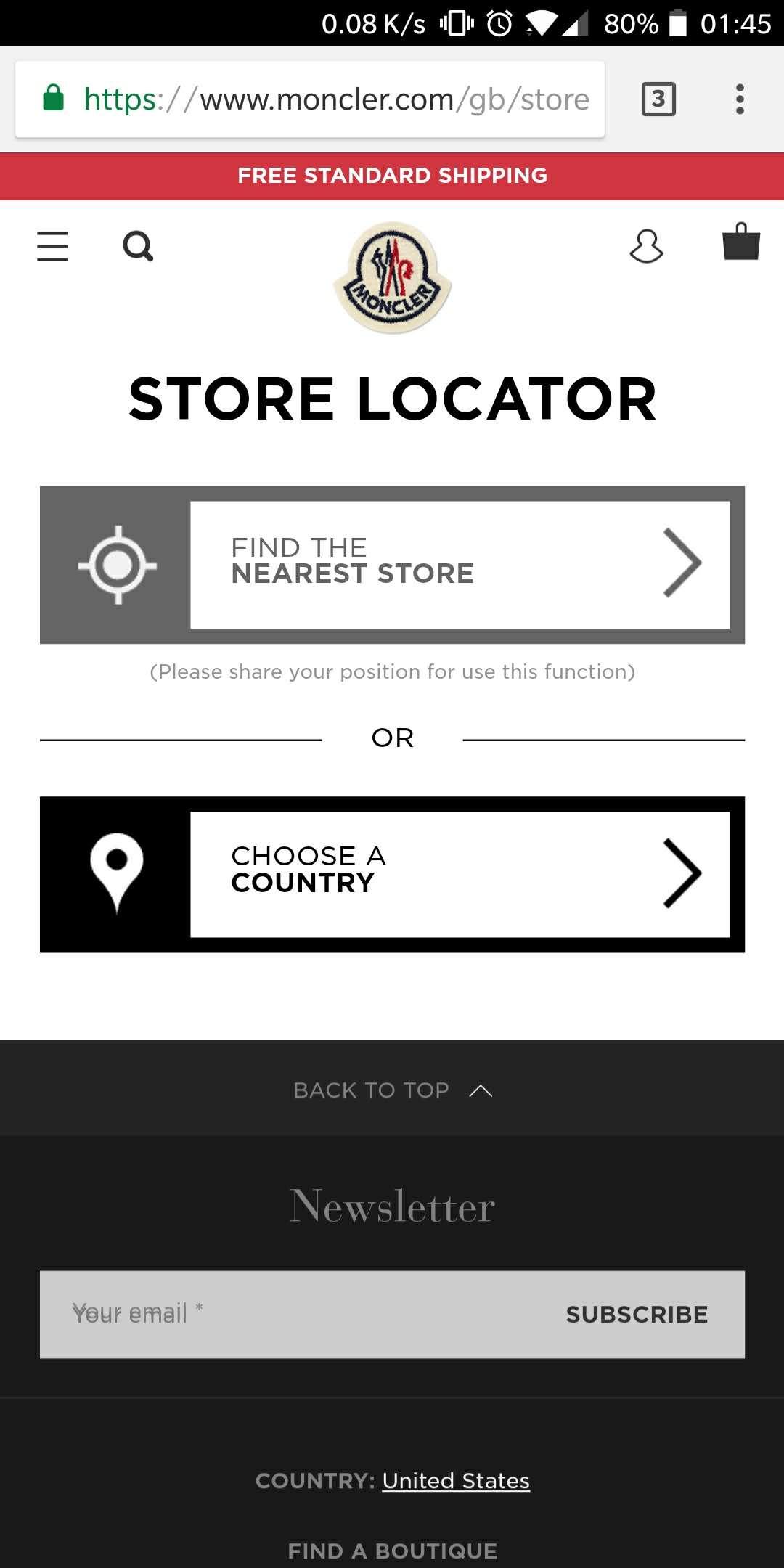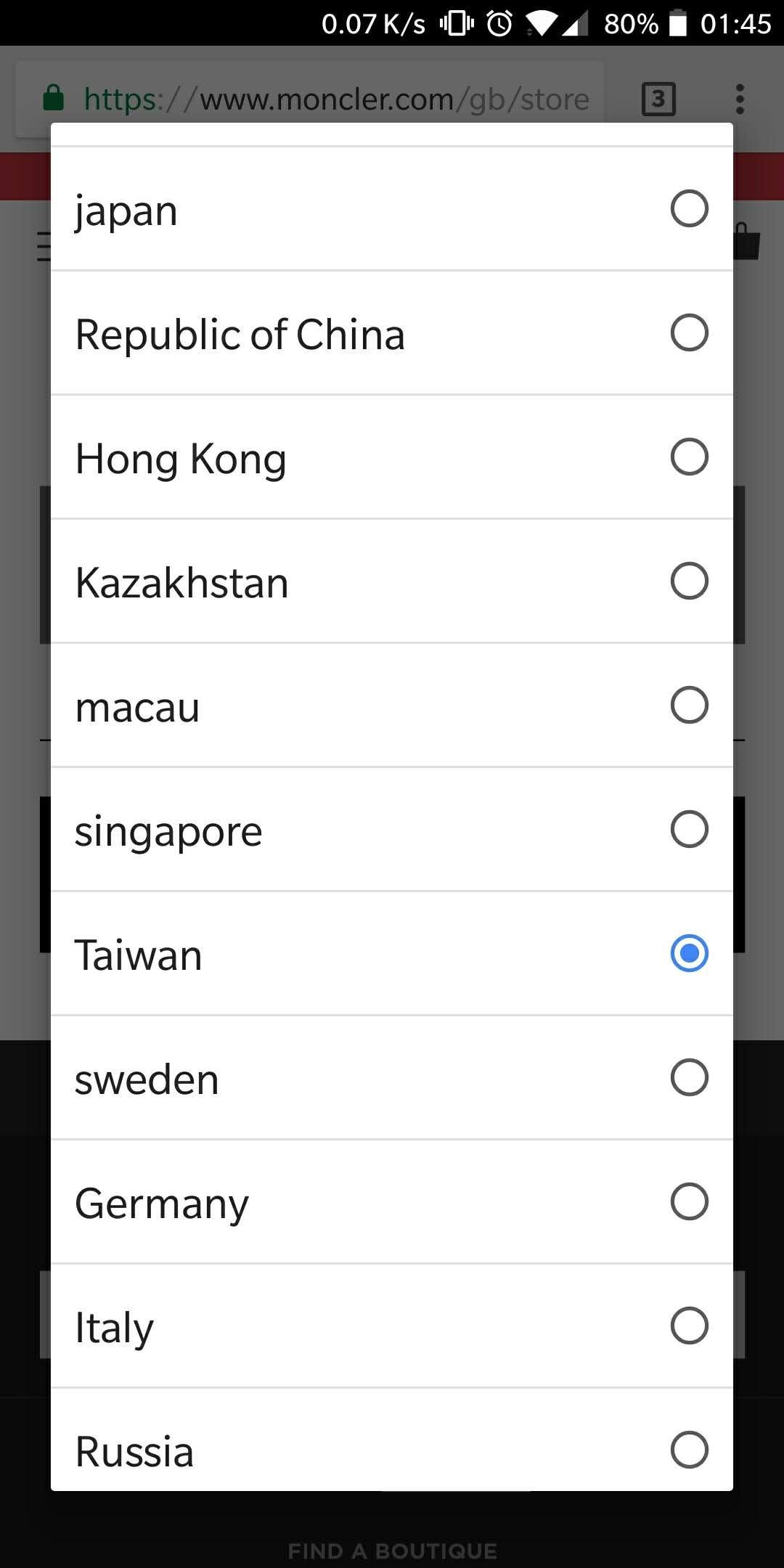 但《环球时报》记者用手机打开Moncler的英文官方网站时,发现 "店铺地址"页面明确标注有"Choose A Country(选择国家)"选项,点开后可以看到台湾、香港和澳门被列为"国家"。