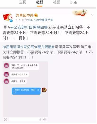 @公安部打四黑除四害也通过微博转发的形式强调:孩子走失请立即报警!不需要等24小时!不需要等24小时!!不需要等24小时!!!(重要的事情说三遍)