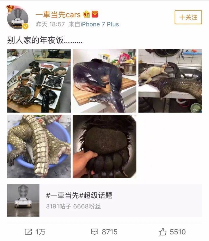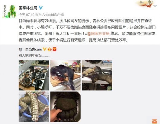 除夕夜,有网友在微博上发布一组"别人家的年夜饭"图片,图中疑有穿山甲、熊掌等保护动物。该微博被国家林业局转发,并通报了森林公安查证。