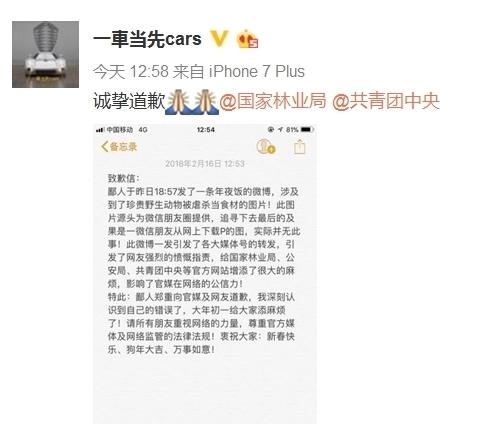 该网友表示,此微博引发了网友强烈的愤慨指责,给国家林业局等官方网站增添了很大的麻烦,特向官媒及网友道歉。
