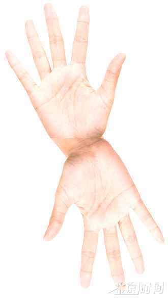 如果大拇指和小拇指根部的大小鱼际处皮肤出现暗红或鲜红色斑块,用手一按,斑块消失,说明出现了“肝掌”,是肝脏疾病的信号。