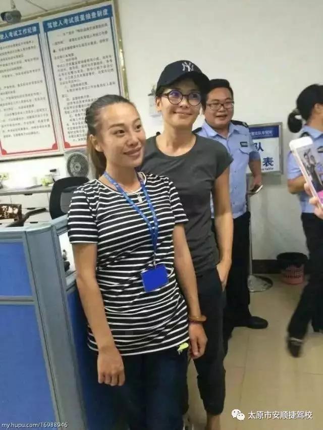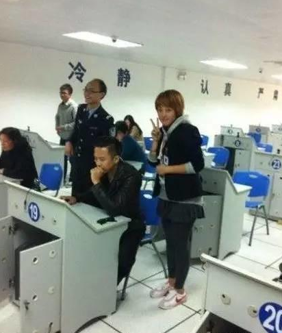 在另一张照片中显示,可能是在考完试后,在一个排队领表的工作室里,刘涛神情愉悦地与工作人员合影留念。看这个样子,应该是考的不错吧。