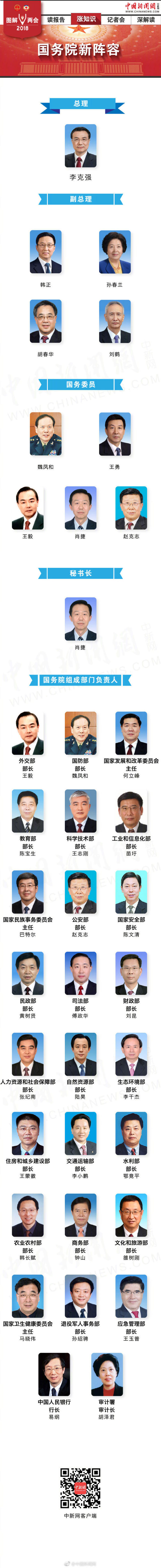两会新华社快讯:大会经投票表决,决定肖捷为国务院秘书长,王毅为外交部长,魏凤和为国防部部长,何立峰为国家发展和改革委员会主任,陈宝生为教育部部长,王志刚为科学技术部部长,苗圩为工业和信息化部部长,巴特尔为国家民族事务委员会主任,赵克志为公安部部长,陈文清为国家