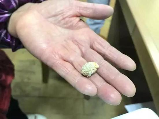 说着,她还向蒋津津展示了那块结石。这块结石长有1.5cm、宽约1.2cm、厚约0.8cm。