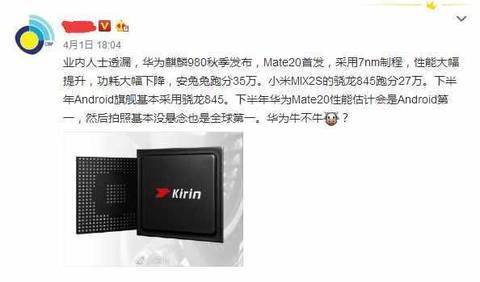 经验来看,骁龙8系列的处理器推出不久后,华为也会跟着推出新一代的高端处理器,目前也有大神爆料,麒麟980或将会在秋季和大家见面,而且是采用7nm工艺,跑分或将高达35万,远超目前的骁龙845处理器。目前华为P20系列的拍照水平已经达到了世界第一,如果麒麟980真的是爆料的这样,那么华为手机的性能又将会达到一个新高度。首发手机将会是华为mate20。