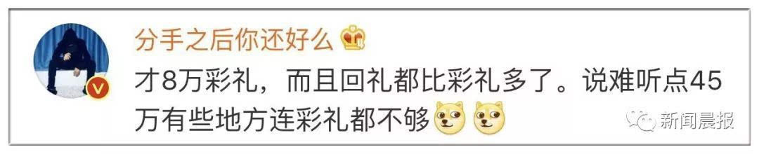 清单中写道,男方给8万彩礼,女方结婚时回礼10万。而小编在网上搜了一下,发现不算北上广,现在无论城市还是农村,彩礼钱基本都是10万起了。再一个是,男方给女方8万,女方还回10万,两边互相抵消后,女方还多出了2万。可见,女友的家庭至少是明事理,有分寸的。