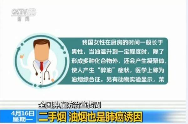 中国抗癌协会临床肿瘤学协作专业委员会委员王修剑:与厨房的排烟灶有一定的关系,我们现在有的家庭排烟灶比较高档一点,有的家庭排烟灶根本排不出去,还有一些贫困的地方没有排烟灶,他们虽然不吸烟,也会导致肺癌的产生,包括食物油等还有其他的问题都可以导致产生肺癌。