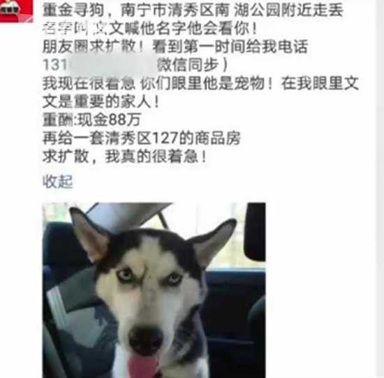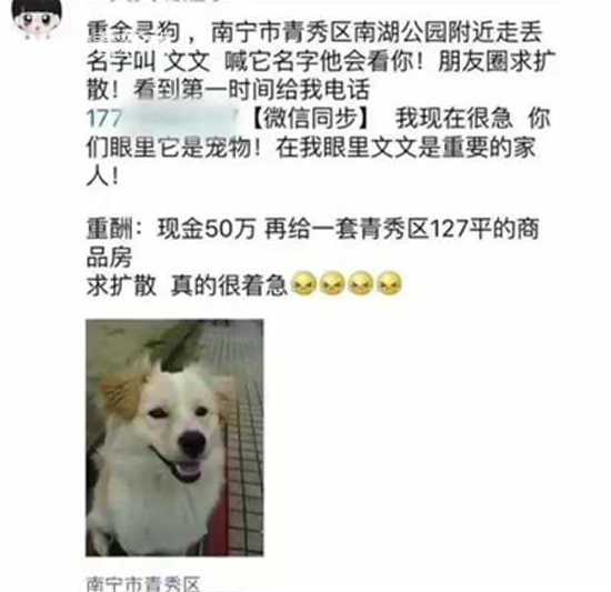 "我现在很急,你们眼里它是宠物!在我眼里文文是重要的家人。"从这则寻狗启事当中似乎不难看出,狗主人对于狗狗的感情,那是非常深沉的!与此同时,狗主人也不忘制造噱头,给出了现金50万!一套青秀区127多平方米的商品房的重酬!有感情,有重酬,这则寻狗启事一出,不少人还真就信以为真了。