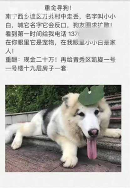 近日,南宁人的社交网络中流传着一则寻狗启示,从内容来看,一只叫做"文文"的狗狗,是在青秀区南湖公园附近走丢了,狗主人称,只要有人帮找到狗狗,就重酬50万元现金和青秀区的一套商品房。听着确实挺诱人的,可这事它到底靠谱吗?