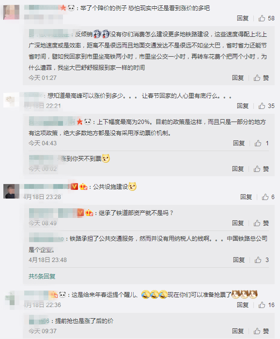 铁路、公路、民航都有一定的基础性、公益性,价格放开只是市场发展趋势中的一环。就像民航票价都有一个打折的规则,铁路调价也具有这样的性质。热门线路上浮、冷门线路下浮,旺季上浮、淡季下浮,甚至同一时段同一车次的不同等级座位有上浮或下调。随行就市的做法,可以把运输需求和票价及时反馈,从而实现运能均衡化,提高上座率,减少“商务座空拉”等资源浪费。除特殊出行高峰期间,市场调价亦做到了更好的让利于低收入群体。旅客享受到了更低的票价,而铁路亦赢得了社会效益和经济效益的双丰收。