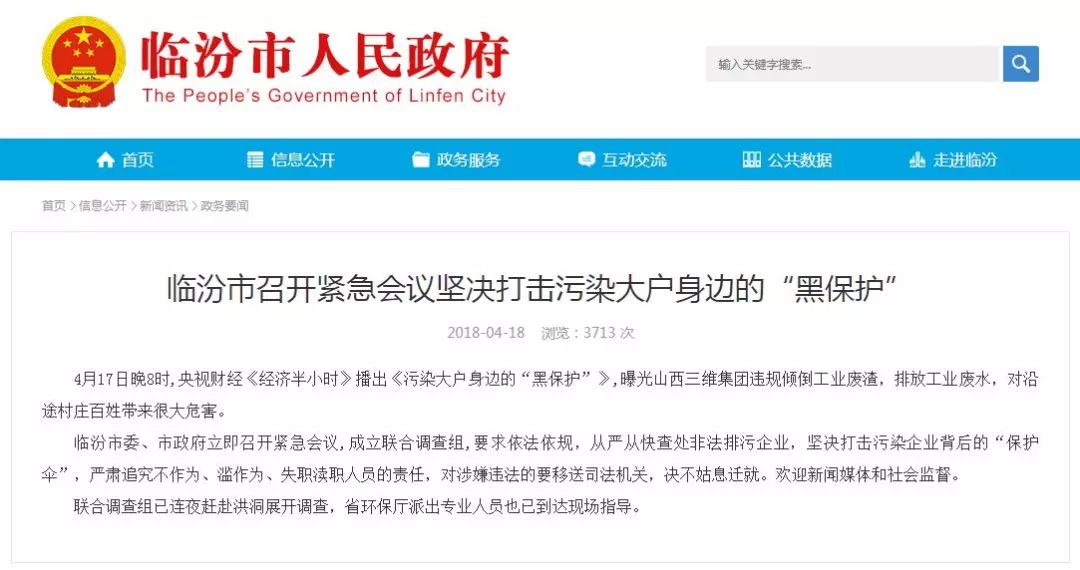 4月17日,央视财经频道“经济半小时”栏目报道,山西省洪洞县三维集团违法倾倒工业废渣污染农田,生产废水直排汾河,记者前去暗访时竟然遭到扣押。