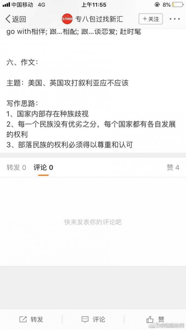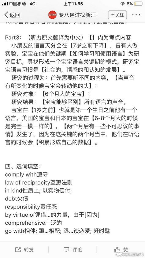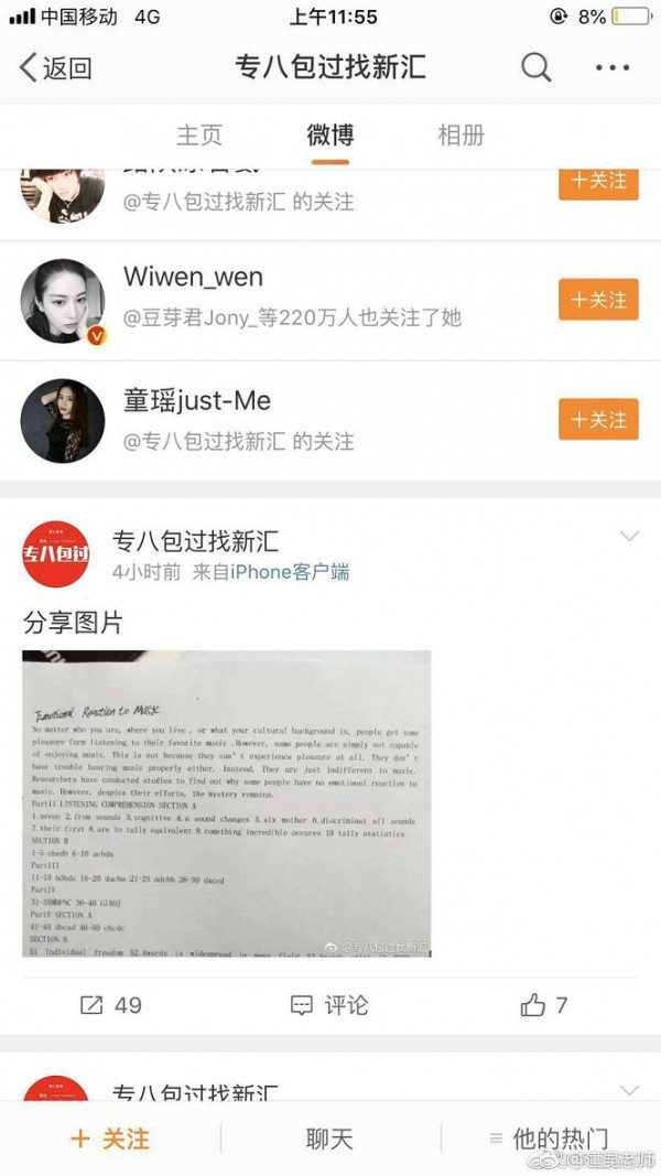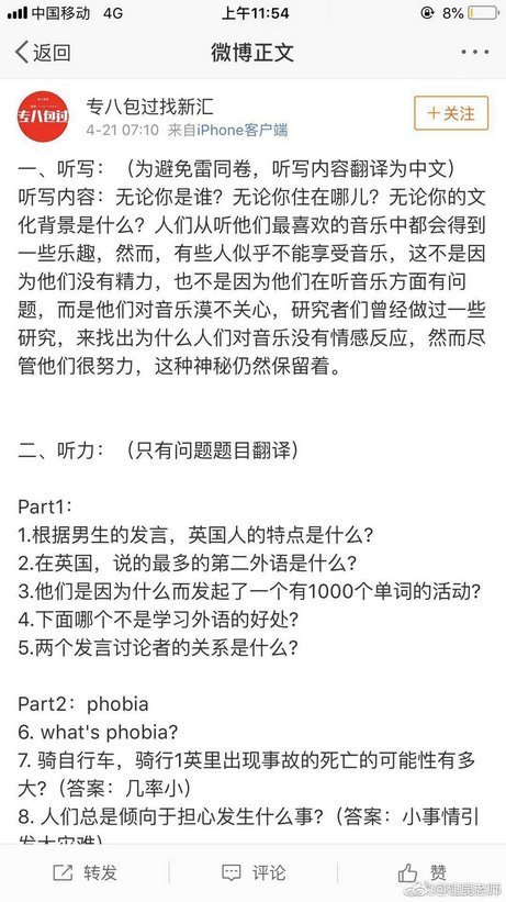 一年一度的英语专业四级考试于今早8点30分开始,而考试刚结束就有网友爆出一个名叫“专八包过找新汇”的微博账号在开考前就贴出了疑似本次考试的题目和参考答案。