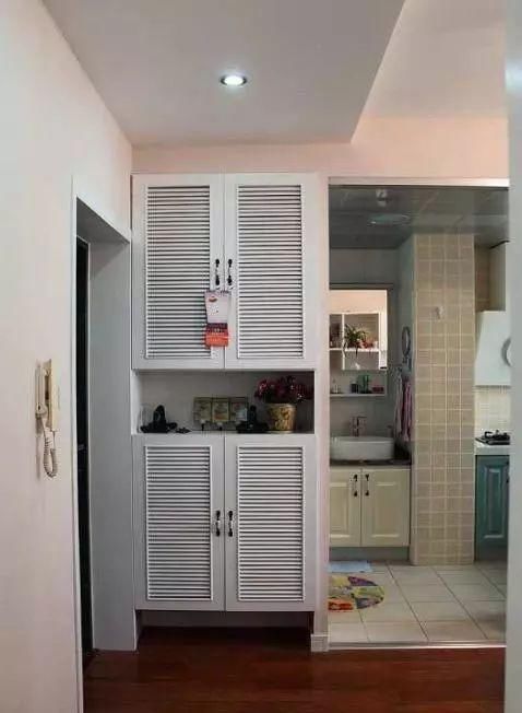 进门玄关空间面积小,在玄关处,利用墙面的厚度和长度做了顶天立地小玄关鞋柜。
