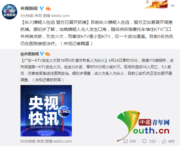 中国青年网电据@央视新闻,目前纵火嫌疑人在逃,警方正加紧展开调查抓捕。据初步了解,当晚嫌疑人与人发生口角,随后将所骑摩托车堵住KTV门口并将其点燃,引发火灾,而事发KTV是小型KTV,仅一个进出通道。目前5名伤员仍在医院接受治疗。