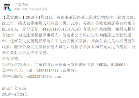 据清远市公安局消息,2018年4月24日,英德市茶园路某三层建筑物发生一起放火案。经工作,确认犯罪嫌疑人刘纯露(男,32岁,英德市英城城西居委会水楼下组14号人,身份证号:441881198612010439)有重大作案嫌疑。嫌疑人臀部有烧伤。为迅速抓获犯罪嫌疑人,清远市公安局决定对刘纯露进行悬赏通缉。任何公民发现其行踪请立即向公安机关举报。凡向公安机关举报或