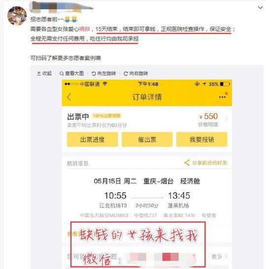 图为微博上的捐卵中介,以"缺钱的女孩来找我"吸引目标,介绍女孩捐卵也能拿提成。