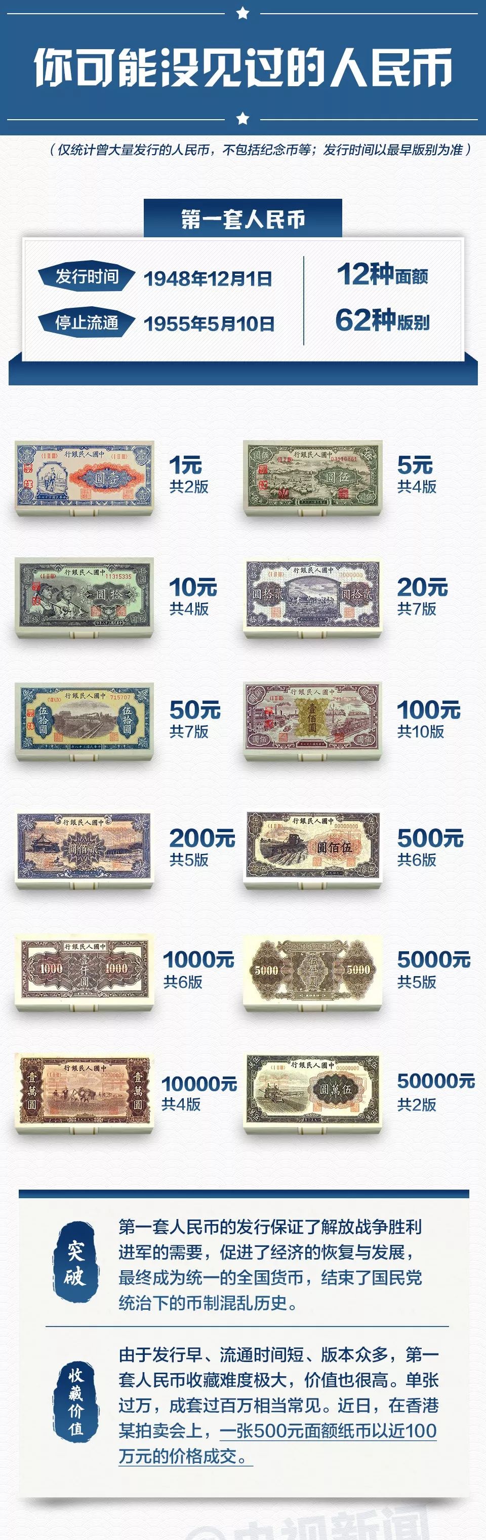除了我们目前常用的第五套人民币,很多网友对已退出历史舞台的“老款”人民币或许并不太了解。第一套人民币长什么样?各套币种的收藏价值有多高?今天,为你准备了一张人民币“图鉴”。如果你家里收藏有不认识的旧币,便可“按图索骥”,说不定你的那张就是值钱的珍品呢!