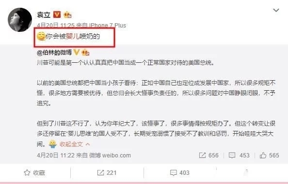 如果说,这条微博他表达只是对美国的夸赞,那么四月二十号袁立转载了一条微博,并评论到,你会被婴儿喷奶的。她所转载的这条微博中,有大量的需要是用来贬低中国,认为在美国面前,中国不过是个孩子。