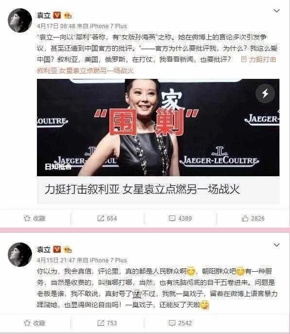 这件事情因前几天美国轰炸叙利亚而起,生活在强大中国的我们,体会不到现代战争的残酷。在多数人认为美国因为自己有强大的科技技术就欺负弱小的国家的时候,袁立却说出了她不同的观点,她认为美国的做法是正确的,是正义的,在微博中更是表现出她对川普的赞美,对美国的向往,对没过科学技术的崇拜。