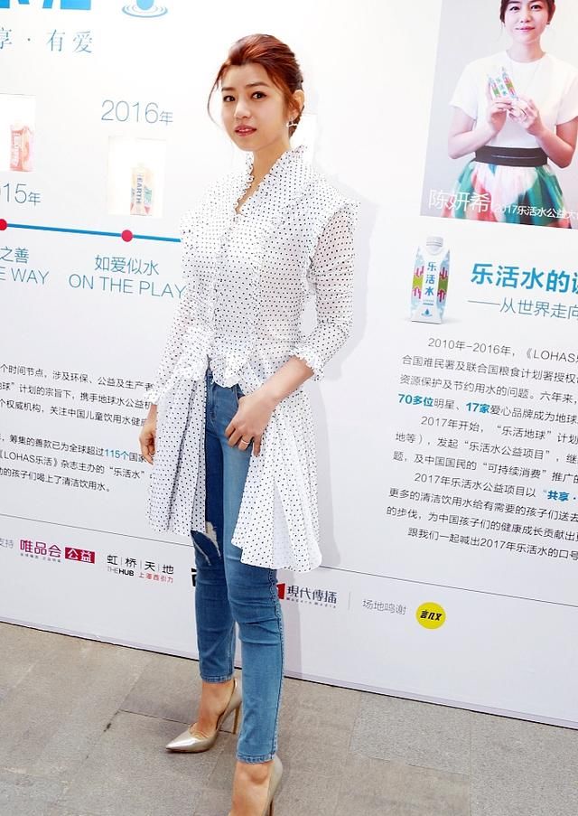 陈妍希最有魅力的地方就是脸蛋笑起来有两个小酒窝,超级可爱的呢。这身搭配也是非常时髦,长款波点衬衫搭配紧身牛仔裤,变胖了的陈妍希穿起来会更好看,完美勾勒身形。