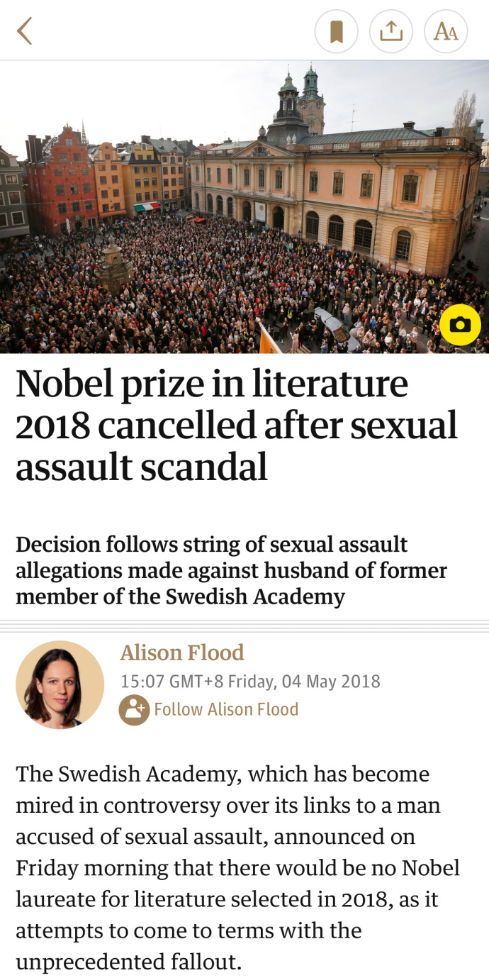 据参考消息早前援引法媒报道,瑞典文学院由于一名院士的丈夫被指控强奸和性侵而深陷危机,可能会推迟颁发2018年诺贝尔文学奖。