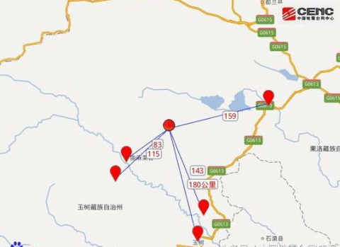 震中距曲麻莱县83公里、距治多县115公里、距称多县143公里、距玛多县159公里、距玉树市180公里,距玉树藏族自治州179公里,距西宁市528公里。