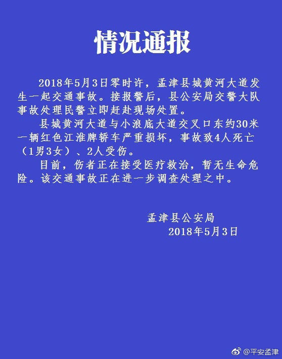 5月3日,孟津县警方证实,当日零时该县黄河大道发生一起4死2伤的交通事故,但未提及具体情况。