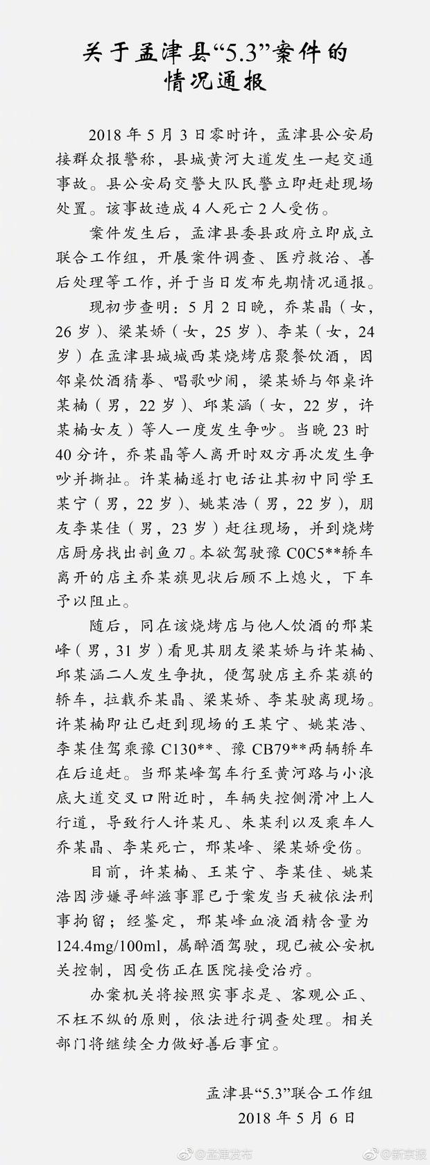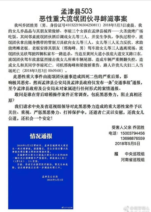 5月3日,孟津县发生一起4死2伤的交通事故。随后一份据称来自遇难者父亲的举报信在网上流传。信中称,当日,举报者女儿与另外两女孩在烧烤广场吃饭,遭邻桌流氓团伙调戏。烧烤摊老板安排朋友驾车带3名女孩离开,却仍被流氓驾驶4辆车追杀,车上两女孩和两路人遇难。今日,微博账号@孟津发布 发布了关于此起案件的情况通报。