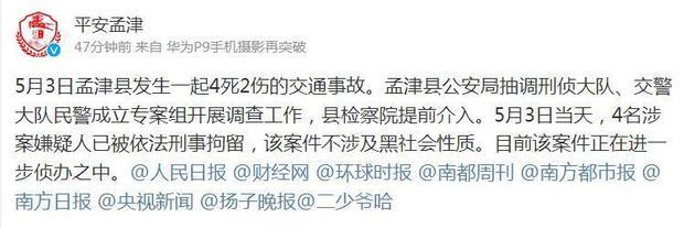 对此,孟津县警方官方微博@平安孟津 今天下午回应称,5月3日孟津县发生一起4死2伤的交通事故。孟津县公安局抽调刑侦大队、交警大队民警成立专案组开展调查工作,县检察院提前介入。5月3日当天,4名涉案嫌疑人已被依法刑事拘留,该案件不涉及黑社会性质。目前该案件正在进一步侦办之中。