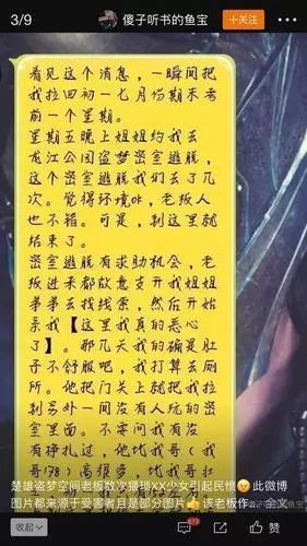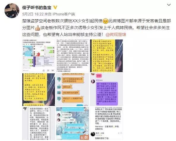 5月2日下午16点22分,一条名为“傻子听书的鱼宝”发微博称:楚雄某密室逃脱游戏室老板数次猥亵少女,并贴出多张自称受害者的聊天记录图片,称“希望有人站出来能够主持公道!”