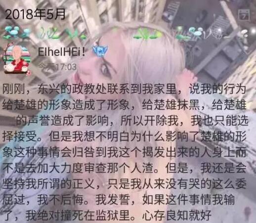 更让人震惊的是:最初为女生正义发声的小皓昨天在QQ空间发表内容称,他的老师认为“这是给美好的楚雄抹了黑,给学校带来了不好的影响”,被要求转学!其母亲证实了这一说法。