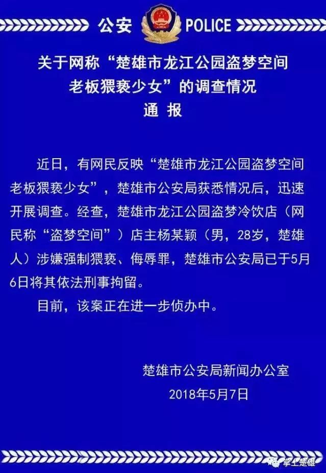 但是,昨天,楚雄市公安局发布调查情况通报:楚雄市龙江公园盗梦空间老板杨某颖,涉嫌强制猥亵、侮辱罪,已于5月6日被依法刑事拘留。目前,该案正在进一步侦办中。