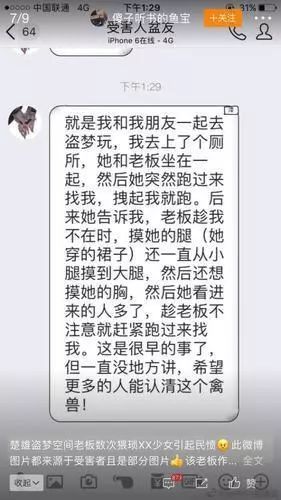 从小皓的手机截图上,可以看到一个个女孩子的讲述。大多是在盗梦空间玩的时候,老板找机会骚扰、猥亵。其中两人自述曾和老板发生关系。