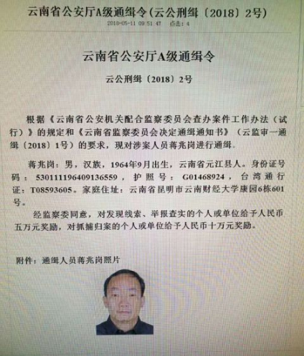 通缉令指出,云南省公安厅依据《云南省公安机关配合监察委员会查办案件工作办法(试行)》的规定和《云南省监察委员会决定通缉通知书》(云监审一通缉〔2018〕1号)的要求, 依法对涉案人员蒋兆岗进行通缉。
