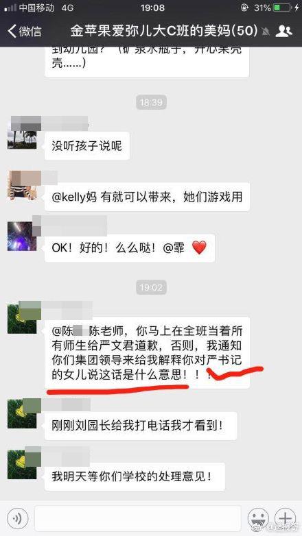 5月11日,微博上广泛流传的一组微信群聊截图显示,"陈某"在群内发言称,"以后严某某放学那会单独坐,或者周围的人给她清空,她单独坐一边,真的是够了。"不久后,群内署名为"严某某妈妈"的人士发言称,"陈老师,你马上在全班当着所有师生给严某某道歉,否则,我通知你们集团领导来给我解释你对严书记的女儿说这话是什么意思!"