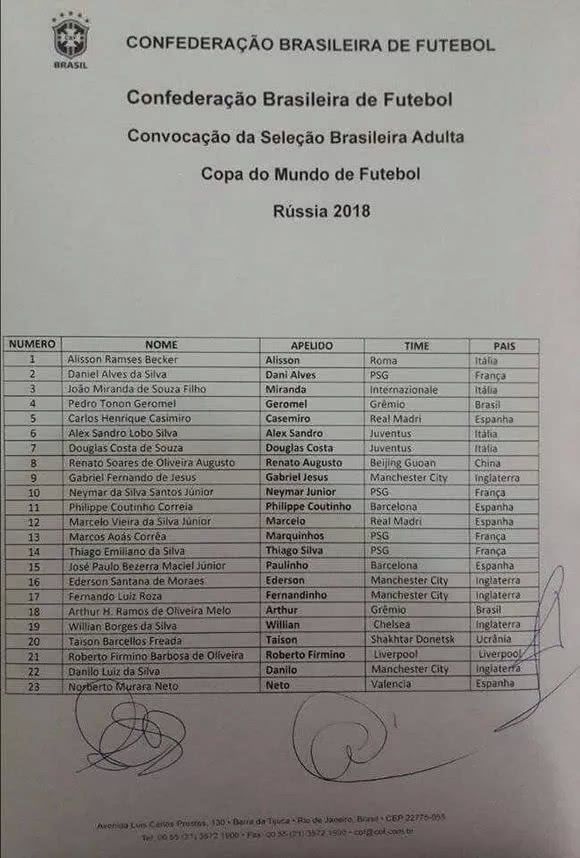 在此之前,巴西国家队世界杯参赛23人民名单已被曝光。中超只有奥古斯托进入到了最终的名单,吉尔、塔尔德利等人都无缘世界杯,这份23人大名单分别是:1、阿利森;2、阿尔维斯;3、米兰达;4、格罗梅尔;5、卡塞米罗;6、A桑德罗;7、D科斯塔;8、奥古斯托;9、热苏斯;10、内马尔;11、库蒂尼奥;12、马塞洛;13、马尔金奥斯;14、T席尔瓦;15、保利尼奥;16、埃德森;17、费尔南迪尼奥;18、亚瑟;19、威廉;20、泰森;21、菲尔米诺;22、丹尼诺;23、内托。
