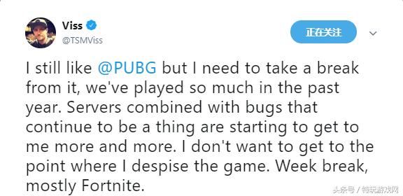 服务器不断出现的bug越来越严重的影响到我了。我不想等到自己厌倦PUBG的那一天的到来,所以我会暂时休息一周,打打堡垒之夜。”